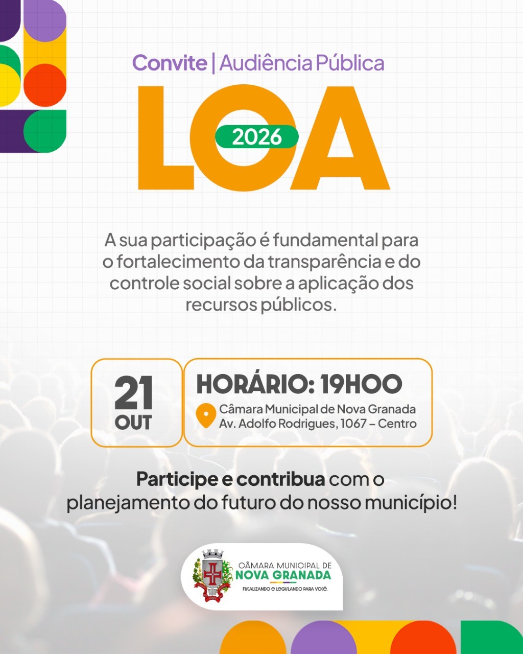 A Câmara Municipal de Nova Granada convida toda a população a participar da AUDIÊNCIA PÚBLICA de apresentação e discussão da Lei Orçamentária Anual (LOA), para o exercício de 2026, que será realizada na próxima terça-feira, dia 21 de outubro, às 19 horas, na sede do Legislativo, localizada na Avenida Adolfo Rodrigues, 1067, Centro.